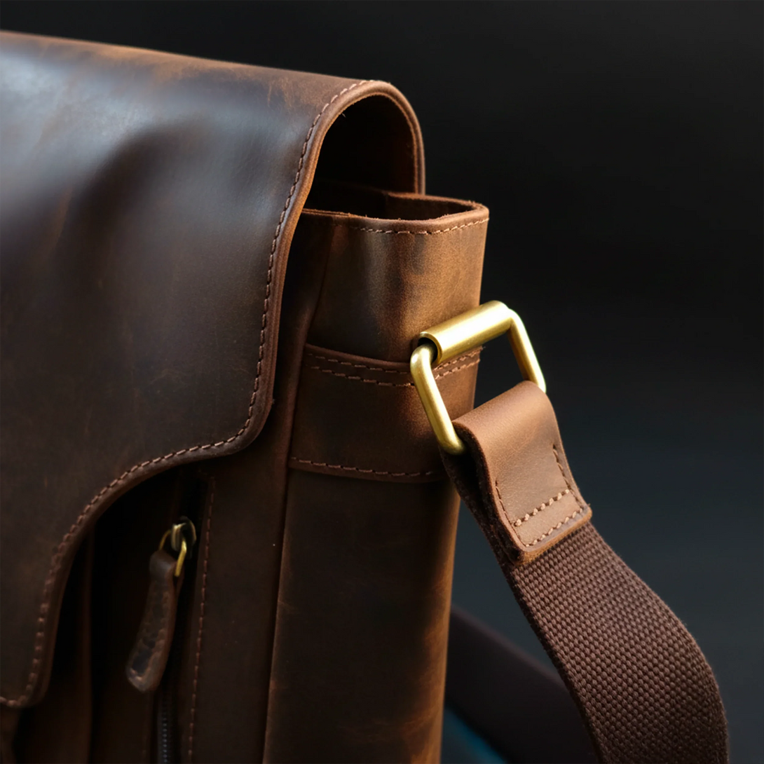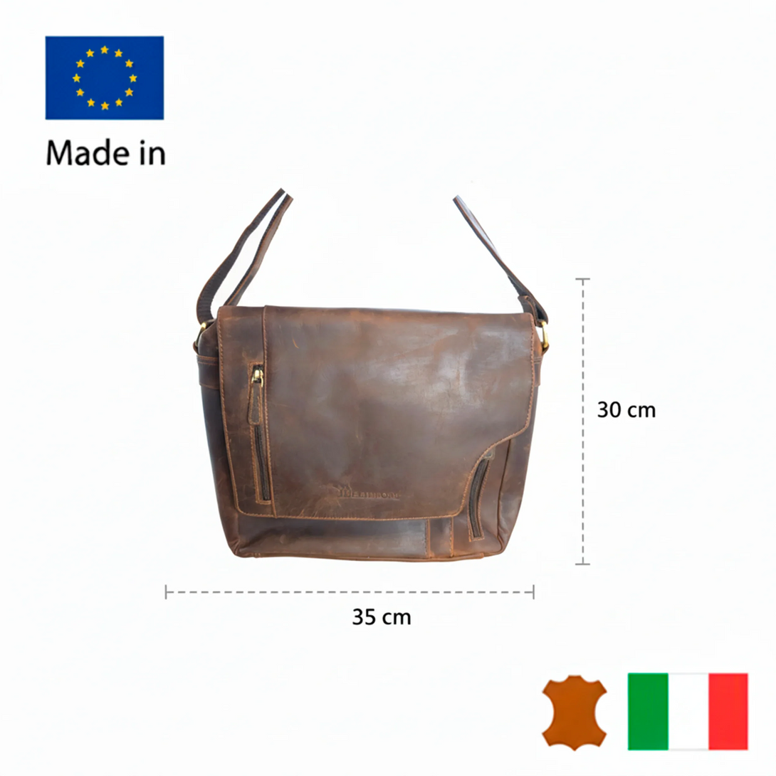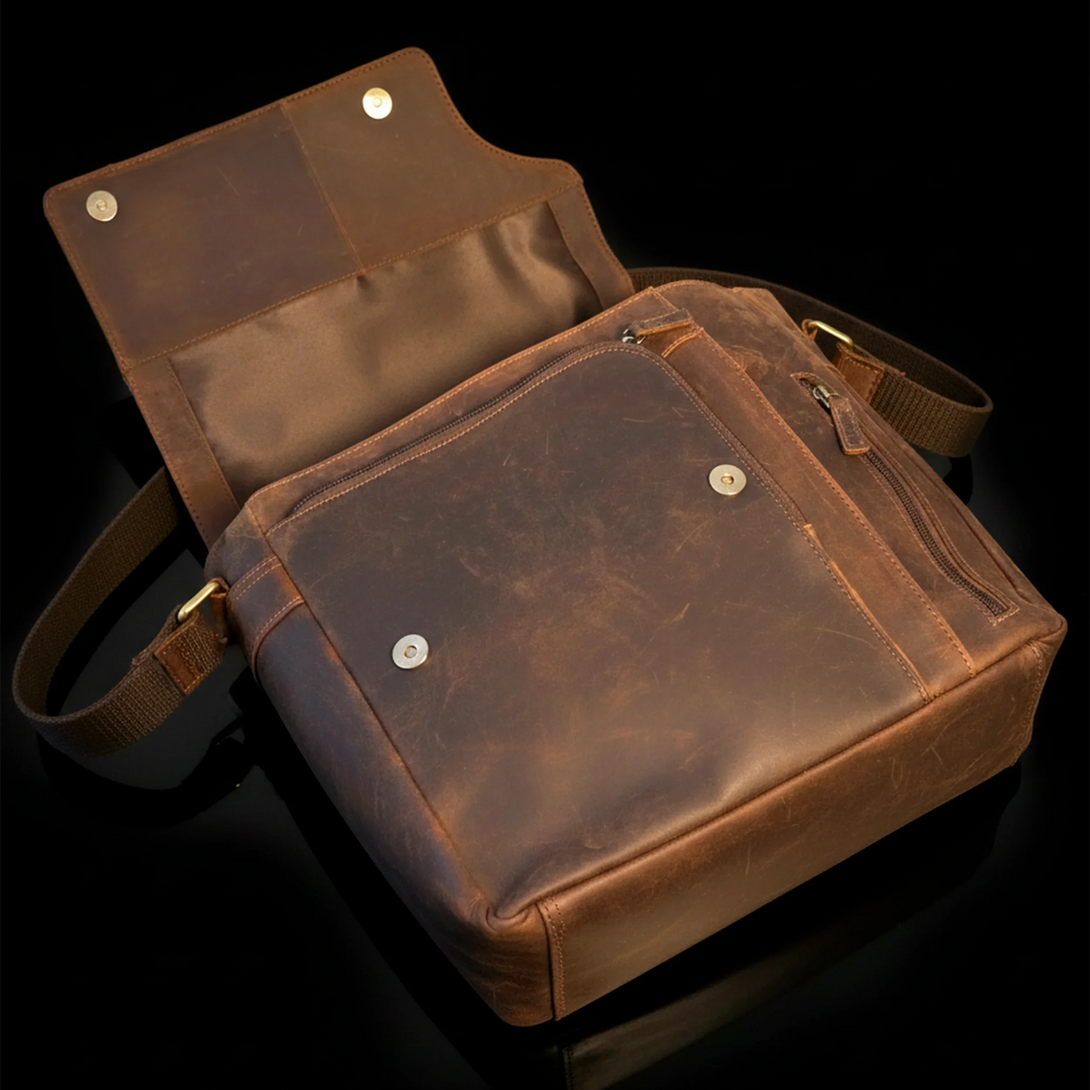 Gemaakt van premium nubuck echt leer in een elegante verouderde bruine tint, is deze exclusieve vintage-stijl tas ontworpen voor wie vakmanschap en functionaliteit waardeert.