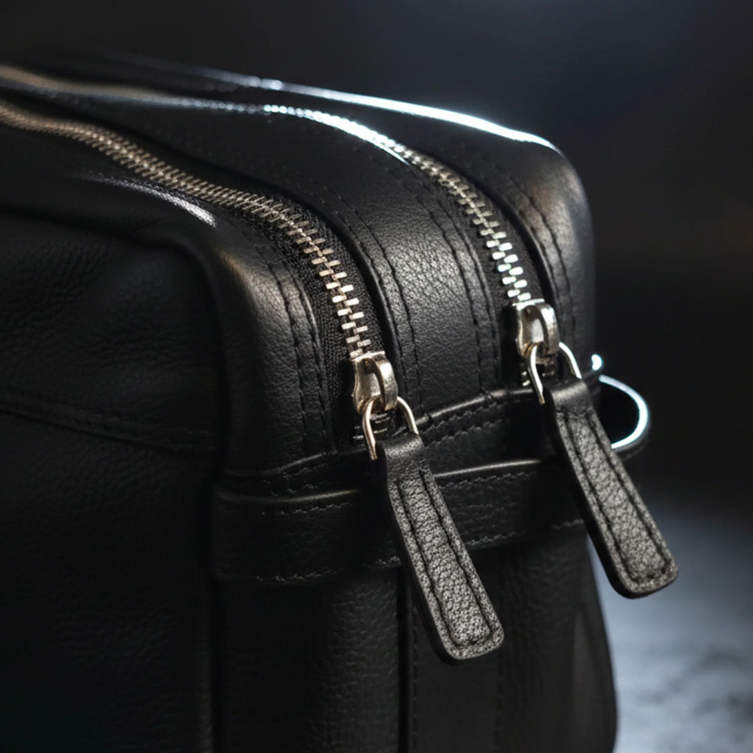 Ta pojemna kosmetyczka z dwoma przegrodami wykonana jest z wysokiej jakości skóry bydlęcej pełnoziarnistej w eleganckim czarnym wykończeniu. Łączy wyrafinowaną elegancję z solidną trwałością, czyniąc ją idealnym towarzyszem podróży.